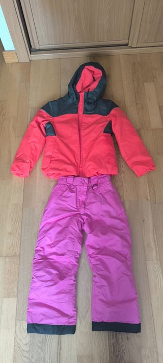 Conjunto de chaqueta y pantalón de nieve para niña. - Chaqueta de color rosa con detalles en gris y capucha. - Pantalón de color rosa con cintura ajustable y bajos grises. Talla de pantalón 110/116 y chaqueta 123/130 para niña de entre 6 y 7 años.