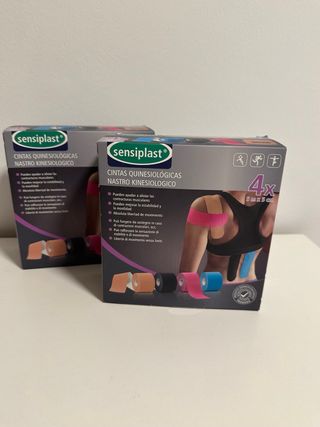 Se venden dos paquetes de cintas kinesiológicas Sensiplast. Cada paquete contiene 4 rollos, haciendo un total de 8 rollos. Están sin abrir y sin usar. Las dos por 12€, una por 7€. - Cintas kinesio. - Fisioterapia - Marca: Sensiplast. - Cantidad: 8 rollos en total (2 paquetes de 4). - Dimensiones por rollo: 5 m x 5 cm.