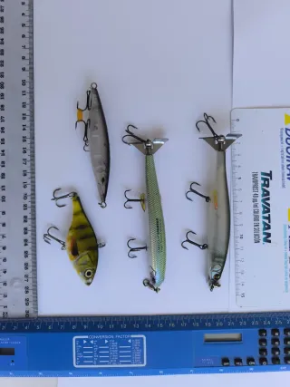 LOTE 4 Formado por tres jerkbait de la marca rapala clásicos de madera de balsa, un lipless hundido color perca, un paseante y otro jerkbait creo que de la marca Salmo o Rapala - Lote indivisible (compras lo que ves en las fotos) no se puede alterar la composición del lote. - Ofertas: compra 3 lotes y ahorra 5€. Compra 5 lotes y eliges un sexto lote totalmente gratis.