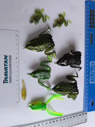 LOTE 63 Formado por ranas de distintos tamaños y colores, las más grandes son flotantes para pescar en zonas de vegetación y entre las algas, y las pequeñas para pescar en el fondo. Incluye un alevín de renacuajo de vinilo. - Lote indivisible (no quito ni añado señuelos de otros lotes a éste y viceversa). Compras todo lo que ves en las fotos del lote. - Ofertas: compras 3 lotes y ahorra 5€. Compras 5 lotes y escoges un lote gratis