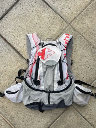 Mochila Raidlight de 12 litros, diseñada para trail running y actividades al aire libre. - Color gris y blanco con detalles rojos. - Compartimentos laterales con cremallera. - Tirantes ajustables y acolchados. - Cierre principal con cremallera.
