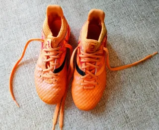 Botas de fútbol infantiles en color naranja con suela multitacos. Perfectas para jugar en césped artificial o natural. Talla 32 - Cierre con cordones. - Suela multitacos para mayor agarre. En una esquina hay un pequeño rasguño ( véase fotos)