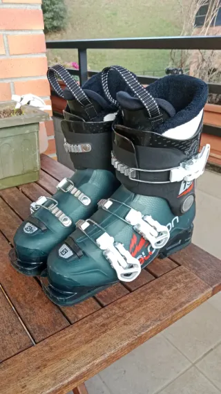 Botas de esquí Salomon para niño. - Color verde oscuro. - Cierre con 4 ganchos. - Hebillas de ajuste. - Interior forrado. - Talla 23-23.5
