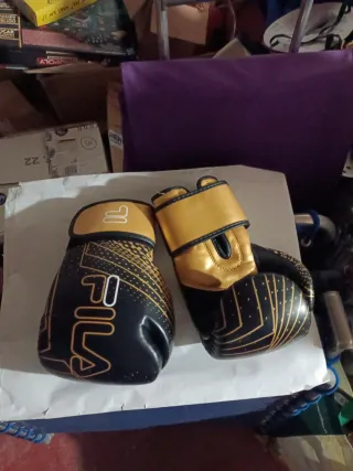 Guantes de boxeo Fila en talla M y 10oz, con un llamativo acabado dorado. - Talla: M - Peso: 10oz - Color: Dorado y negro