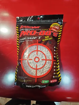Bolsa de bolas de airsoft de la marca Zasdar. - Modelo: Pro-BB's Ultra Precision. - Peso: 0,30g. - Cantidad: 1kg. - Biodegradables (BIO). - Alta precisión y pulido. - Sin burbujas.