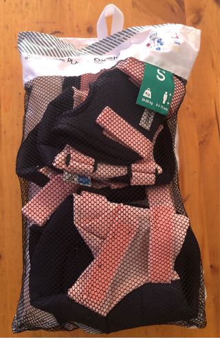 Set de protecciones de talla S, ideal para deportes como patinaje, fútbol o scooter. - Talla S. - Peso recomendado: 30-50 kg. - Edad recomendada: 9-15 años. - Color: Negro y rosa. envíos solo por correos