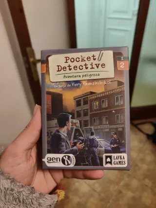 Juego de mesa Pocket Detective, edición Aventura peligrosa. - Juego de Yury Yamshchikov. - Incluye los números 1 y 2. - Ilustraciones de escena urbana con policía y ambulancia. - Logos de Gen X Games y Lavka Games.