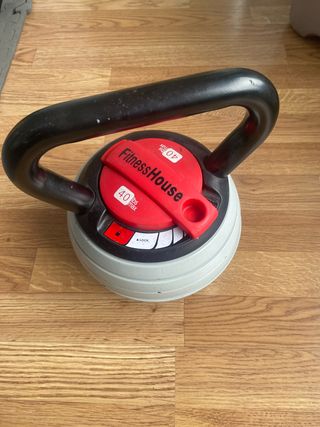Kettlebell ajustable de la marca FitnessHouse, con un peso máximo de 40 lbs. - Diseño desmontable para fácil ajuste de peso. - Mango ergonómico para un agarre cómodo. - Indicador de peso en la parte superior.