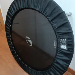 Trampolín de la marca Domyos. - Diseño circular. - Cubierta protectora negra. - Malla de salto. - Logotipo de la marca visible.