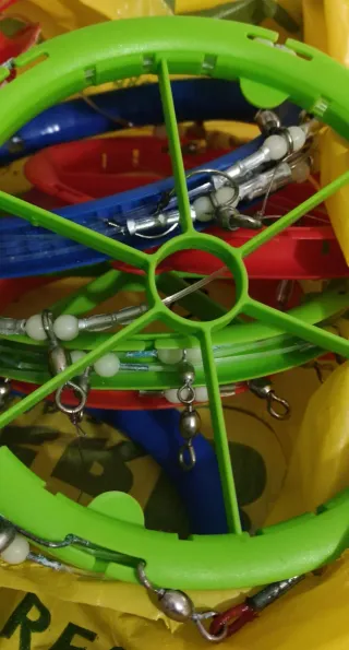 Lote de aparejos de pesca de fondo. - Varios carretes para anzuelos y plomos. - Colores: verde, rojo y azul. - Incluye esmerillones y perlas. Escucho ofertas