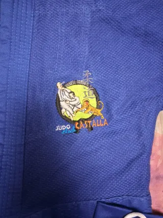 Judogui de color azul con bordado del club Judo Castalla. - Diseño con dos figuras practicando judo. - Incluye un tigre y caracteres japoneses. - Bordado VANESA ARENAS y JUDO CASTALLA CLUB.