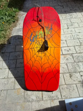 Tabla de playa o surf con un diseño inspirado en Spider-Man. Ideal para disfrutar del mar. - Diseño de telaraña en tonos rojos y naranjas. - Cuerda de sujeción incluida.