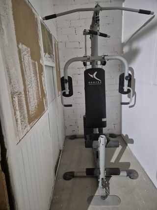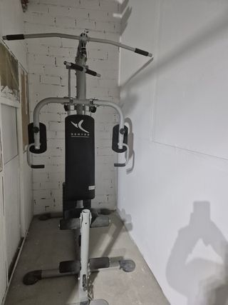 Equipo de gimnasio para entrenar en casa. Diseñado para una variedad de ejercicios. - Estructura metálica robusta. - Asiento acolchado. - Barras y agarres para diferentes movimientos.