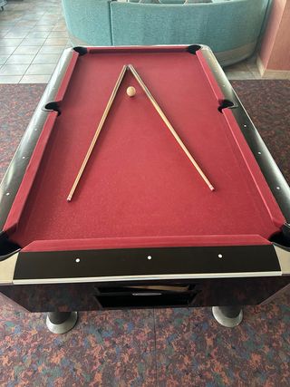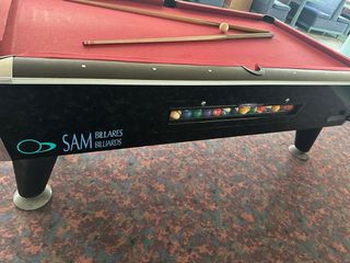 Mesa de billar de la marca Sam. Ideal para disfrutar en casa o en locales. - Superficie de juego de color rojo. - Patas robustas para mayor estabilidad. - Incluye tacos y bola.