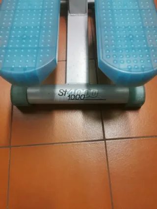 Stepper ST 1000 para ejercicio en casa. - Pantalla digital con contador, tiempo y calorías. - Pedales antideslizantes con textura. - Estructura metálica y detalles en azul.