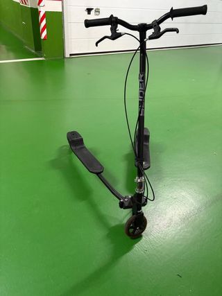 Patinete eléctrico de color negro, ideal para desplazamientos urbanos. - Diseño plegable para facilitar su transporte. - Ruedas con detalles en rojo. - Incluye pata de apoyo. - Tiene un a pequeña raja en el cubrerueda
