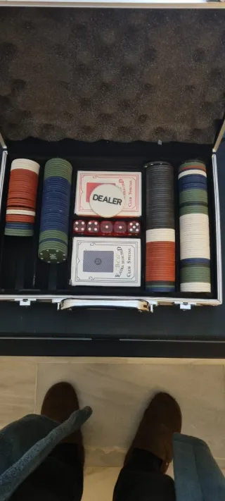 Maletín de póker con todos los accesorios necesarios para una partida. - Incluye fichas de diferentes colores y valores. - Contiene dados rojos. - Incluye cartas y ficha de 'Dealer'.