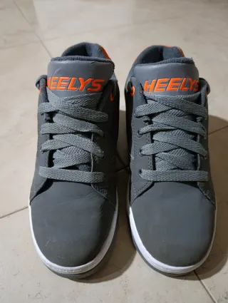 Zapatillas deportivas marca Heelys en color gris con detalles naranjas. Talla 36,5 con ruedas que se quitan y sirven como zapatillas deportivas. Las tapas cuando se quita las ruedas no las encuentro pero no afecta a su funcionamiento, de hecho mi hijo no se las ponía para no llevarlas encima. De ahí su precio. Están como nuevas. Nuevas valen 56-60€. - Diseño moderno. - Cierre con cordones.