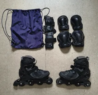 Con marcas de uso (se ven en las fotos) pero funcionan perfectamente. - Talla 44. - Incluye bolsa para las protecciones. - Juego de protecciones, talla L: muñequeras (a una le falta una protección,se ve en la foto), coderas y rodilleras.