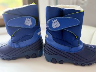 Botas de nieve para niño, ideales para mantener los pies calientes y secos en el frío. - Diseño azul con detalles en verde. - Cierre de velcro para un ajuste fácil. - Forro interior suave y cálido. - Suela de goma antideslizante.