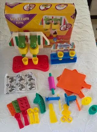 Set de heladería para jugar con plastilina. - Incluye máquina para hacer helados, moldes y accesorios varios. - PLASTILINA NO INCLUIDA. - Dispone de caja original e instrucciones (ver fotos para comprobar estado) - Todos los moldes y accesorios están en buenas condiciones a excepción del molde para cucuruchos que sigue funcionando pero está como se muestra en la última foto. - Con uso, pero salvo caja, instrucciones y molde de cucuruchos está en buen estado (precio reducido por este motivo).