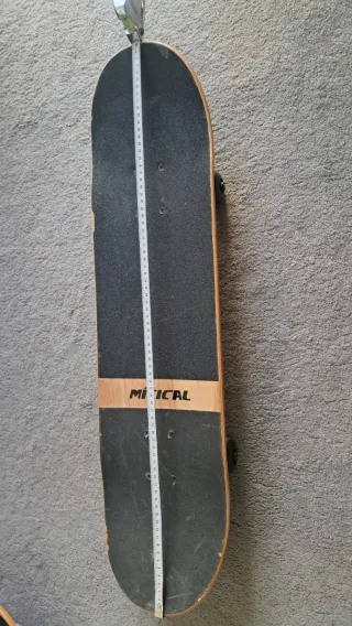 Monopatín con un diseño llamativo de lobo aullando en la tabla. La parte trasera es negra y la delantera tiene un acabado en madera natural. - Diseño de lobo a tinta. - Tabla de madera. - Ruedas negras.