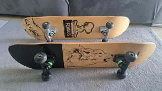 Se venden dos monopatines. - Uno con diseño de Snoopy y el logo de Peanuts. - Otro con diseño de lobo y parte superior negra.