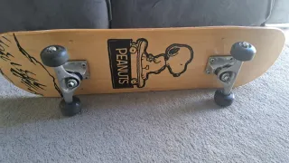 Monopatín con diseño de Snoopy de Peanuts. - Tabla de madera. - Ejes metálicos. - Ruedas negras.