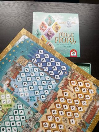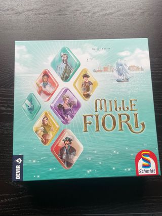 Juego de mesa Mille Fiori, diseñado por Reiner Knizia. - Ilustraciones de personajes y escenarios marinos. - Incluye logos de Devir y Schmidt.