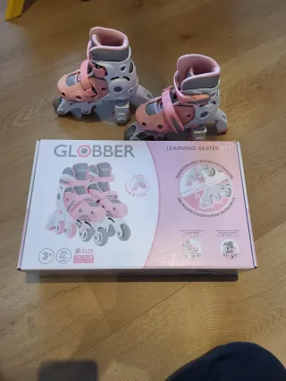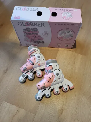 Set de patines infantiles Globber en color rosa y blanco. Son transformables para adaptarse al aprendizaje. - Diseño 3 en 1. - Talla ajustable. Usados solo tres veces
