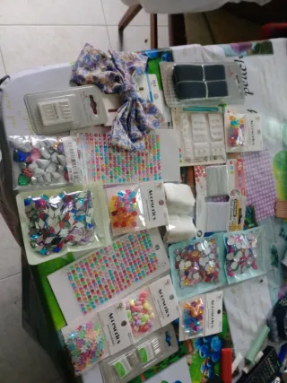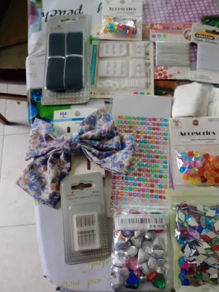 Conjunto de 21 artículos variados para costura y manualidades. - Adornos de pedrería autoadhesivos en varios colores y formas. - Cuentas y abalorios para bisutería. - Cintas de tela decorativas. - Kits de agujas para máquina de coser. - Broches y cierres para ropa. - Lazos de tela estampada.