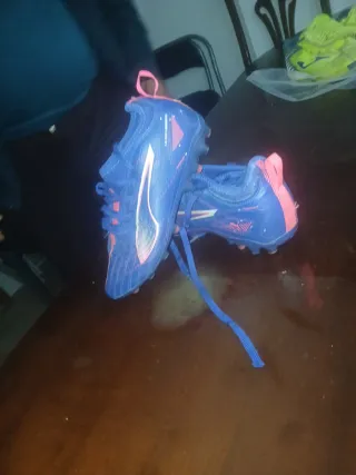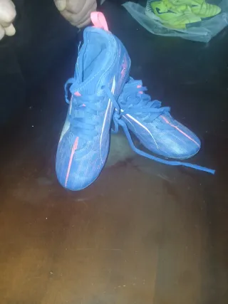 Botas de fútbol Puma Ultra 5 Match en talla 33. Diseñadas para césped. - Color azul con detalles en rosa. - Cierre con cordones.
