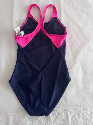 Bañador de natación para niña de la marca Arena. Diseño deportivo y cómodo. - Color azul marino con detalles en rosa. - Tirantes cruzados en la espalda. - Logo de Arena en el pecho.