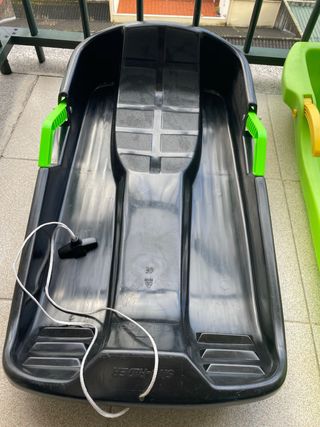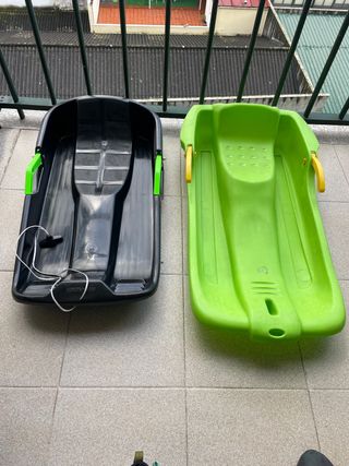 Se venden dos trineos para la nieve, uno negro y otro verde. - Trineo negro con asa y cuerda. - Trineo verde con asas laterales.