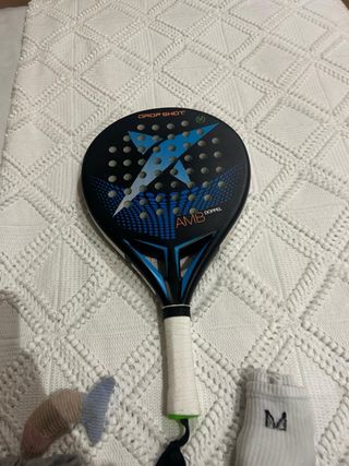 Pala de pádel Drop Shot con diseño moderno. - Color negro con detalles en azul. - Logo de Drop Shot en la cara. - Modelo AMB Doppel.