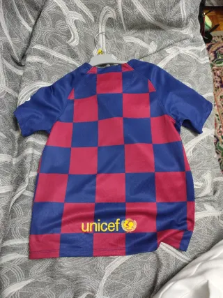 Camiseta oficial del FC Barcelona. - Diseño a cuadros azulgrana. - Logo del club y patrocinador visibles. - Mangas cortas.