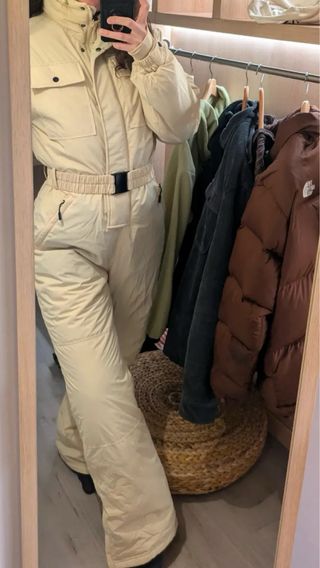 Chaqueta acolchada de color crema, ideal para la nieve. - Cuello alto. - Cierre de cremallera. - Bolsillos frontales con cremallera. - Puños con cremallera. Talla M