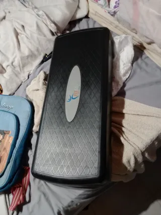 Plataforma de step para ejercicios de fitness. Permite ajustar la altura para diferentes intensidades de entrenamiento. - Color principal: negro. - Incluye soportes de elevación en color rojo.