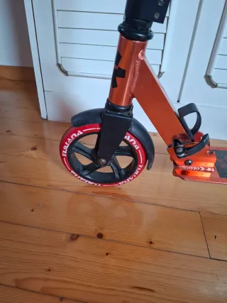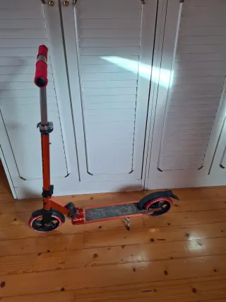 Patinete de la marca Tijuana en color naranja. - Empuñaduras NUEVAS, recién puestas. - Manillar ajustable en altura. - Con pata de cabra para estacionar. - Ruedas de goma en buen estado. - Plegable. - Plataforma antideslizante.