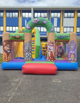 Se vende hinchable de salto con tobogán. Necesita una reparación (se ve en las fotos) pero por lo demás el resto del hinchable está en muy buen estado. Actualmente tiene una reparación provisional y puede utilizarse, pero necesita ser reparado profesionalmente. No incluye motor ni envío. Medidas: 6'5 x 5'5 x 4'5 metros.