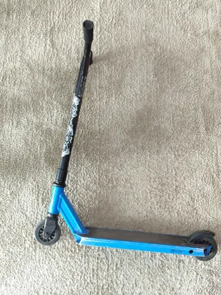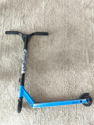 Patinete Oxelo ONE de color azul. Diseñado para jóvenes (5-8 años) que desean descubrir las primeras sensaciones en un patinete de freestyle. El patinete tiene aspecto usado con sus roces y desgaste natural de su actividad pero está bien de rodamientos y robustez