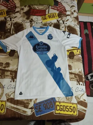 Camiseta deportiva de la marca Kappa con el patrocinio de Estrella Galicia. ORIGINAL - Diseño blanco con detalles en azul. - Logo de Kappa en las mangas y el pecho. - Escudo del equipo en la parte frontal Descuento y bajada de precio