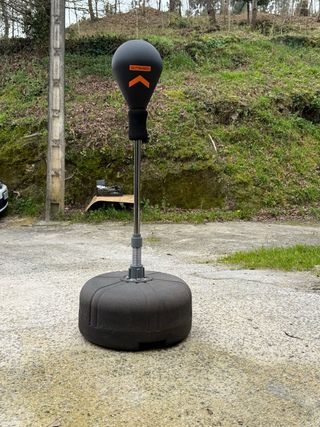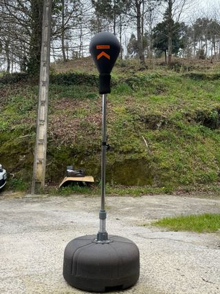 Pera de boxeo de la marca Outshock, ideal para entrenamiento. - Base ancha y estable. - Altura ajustable. - Diseño en color negro con detalles naranjas.