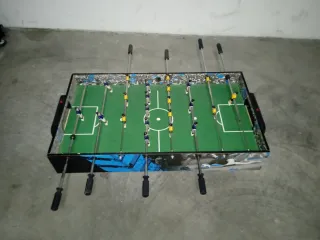 Futbolín de mesa para horas de diversión. - Campo de juego verde con líneas blancas. - Jugadores azules y amarillos. - Barras metálicas con mangos negros. Contador de goles Mide la caja 1,10 cm de largo y 60 de ancho sin contar el largo del mango y 20 centímetros de alto Se puede ver sin compromiso a recoger en padul granada no se hacen envíos a no ser que lo pague el comprador