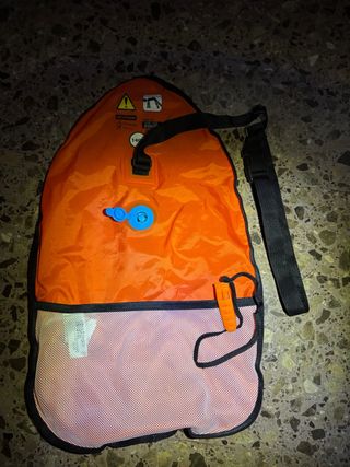 Boya de salvamento acuático en color naranja brillante, con malla inferior para guardar objetos. - Material resistente. - Cierre de clip y correa ajustable. - Válvulas de inflado azul. -Con silbato potente.