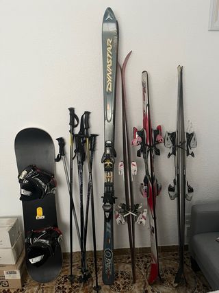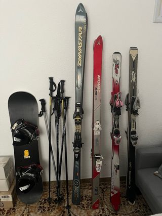 Pack completo de esquís y snowboard con 4 pares de esquís y un snowboard con bota Talla 38, fijaciones en buen estado 160€ todo. - Snowboard negro con fijaciones. - Esquís Dynastar. - Esquís Atomic Active Lite. - Esquís Fischer. - Bastones de esquí.