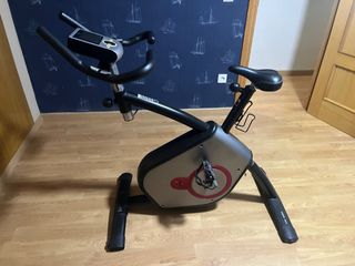 Bicicleta estática Domyos, modelo VM 650, ideal para entrenamientos en casa. Su diseño permite una posición cómoda para pedalear. - Manillar ajustable. - Sillín ergonómico. - Pantalla digital con información de entrenamiento. - Soporte para botella de agua.