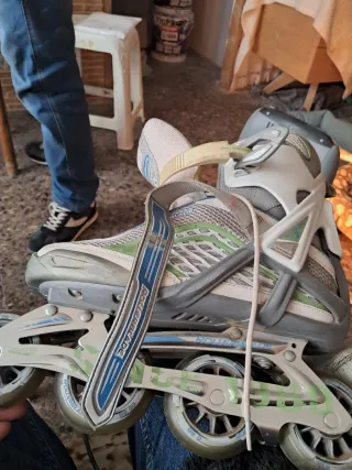 Patines en línea de la marca Rollerblade, modelo Training. - Color beige y gris. - Cierre de velcro y cordones.