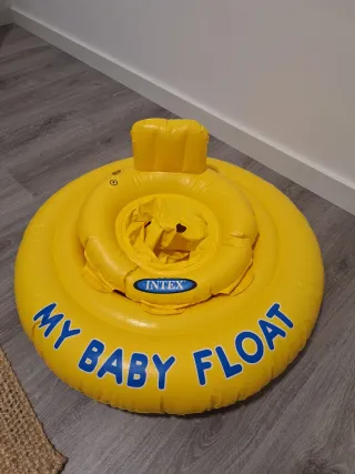 Flotador amarillo para bebés de la marca Intex, modelo My Baby Float. Diseñado para ofrecer seguridad y comodidad. - Color amarillo brillante. - Incluye un respaldo inflable para mayor soporte. - Diseño con MY BABY FLOAT impreso en azul.