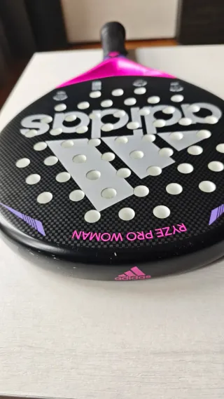 Pala de pádel Adidas Ryze Pro Woman con un diseño moderno y llamativo. - Pala de pádel Adidas. - Modelo Ryze Pro Woman. - Diseño en negro con detalles en rosa y morado. - Logo de Adidas en blanco. - Formato redondo, ligera y con la goma blanda - Tiene muy poco uso, solo está un poco rozada arriba, pero por lo demás está en perfecto estado